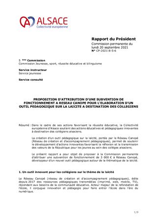 Dans le cadre de ses actions favorisant la réussite éducative, la Collectivité européenne d’Alsace soutient des actions éducatives et pédagogiques innovantes à destination des collégiens alsaciens. La création d’un outil pédagogique sur la laïcité, portée par le Réseau Canopé (Réseau de création et d'accompagnement pédagogiques), permet de soutenir le développement d’actions innovantes favorisant la réflexion et la transmission des valeurs de la République pour les jeunes au sein des collèges alsaciens. Le présent rapport a pour objet de proposer à la Commission permanente d’attribuer une subvention de fonctionnement de 3 000 € à Réseau Canopé, développeur d’un nouvel outil pédagogique autour de la thématique de la laïcité.