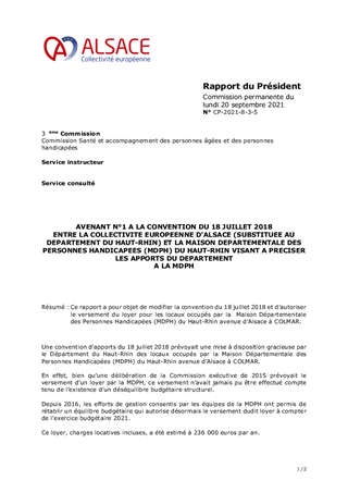 Ce rapport a pour objet de modifier la convention du 18 juillet 2018 et d’autoriser le versement du loyer pour les locaux occupés par la Maison Départementale des Personnes Handicapées (MDPH) du Haut-Rhin avenue d’Alsace à COLMAR.