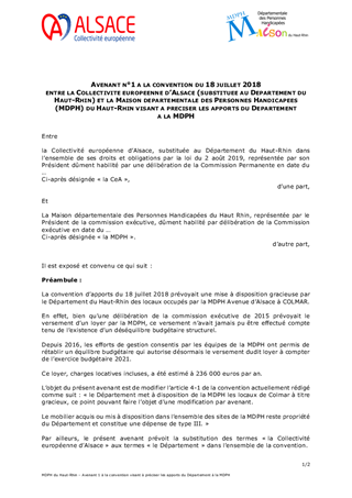 AVENANT N°1 A LA CONVENTION DU 18 JUILLET 2018 ENTRE LA COLLECTIVITE EUROPEENNE D'ALSACE (SUBSTITUEE AU DEPARTEMENT DU HAUT-RHIN) ET LA MAISON DEPARTEMENTALE DES PERSONNES HANDICAPEES (MDPH) DU HAUT-RHIN VISANT A PRECISER LES APPORTS DU DEPARTEMENT A LA MDPH