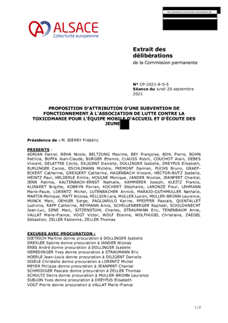Le Conseil départemental du Bas-Rhin a affirmé sa politique jeunesse à travers le Plan d'actions Enfance Jeunesse Famille 2018-2023 (PAEJF), "Un avenir pour nos enfants" adopté par l'Assemblée plénière le 25 juin 2018 (CD/2018/021). Ce plan venait compléter le Plan Actions Educatives et Collèges (PAEC) adopté le 20 mars 2017 et confirmer l'ambition du Département du Bas-Rhin pour construire l'avenir des jeunes Bas-Rhinois. Dans ce cadre, depuis sa création le 1er janvier 2021, la Collectivité européenne d'Alsace continue d'aider les jeunes à grandir pour contribuer à leur autonomie et leur donner confiance en l'avenir (Axe 5 du Schéma Enfance Jeunesse Famille). Il est proposé à la Commission permanente d’attribuer une subvention de fonctionnement à l’Association de Lutte contre la Toxicomanie (ALT), pour permettre la poursuite de l'activité de l'équipe mobile d'accueil et d'écoute des jeunes dans le nord et l'ouest du territoire bas-rhinois.
