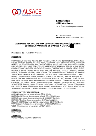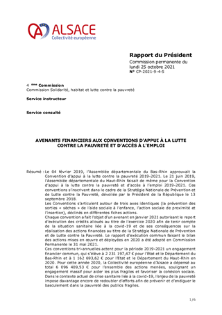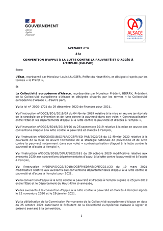 Le 04 février 2019, l’Assemblée départementale du Bas-Rhin approuvait la Convention d’appui à la lutte contre la pauvreté 2019-2021. Le 21 juin 2019, l’Assemblée départementale du Haut-Rhin faisait de même pour la Convention d’appui à la lutte contre la pauvreté et d’accès à l’emploi 2019-2021. Ces conventions s’inscrivent dans le cadre de la Stratégie Nationale de Prévention et de Lutte contre la Pauvreté, dévoilée par le Président de la République le 13 septembre 2018. Les Conventions s’articulent autour de trois axes identiques (la prévention des sorties « sèches » de l’aide sociale à l’enfance, l’action sociale de proximité et l’insertion), déclinés en différentes fiches actions. Chaque convention a fait l’objet d’un avenant en janvier 2021 autorisant le report d’exécution des crédits alloués au titre de l’exercice 2020 afin de tenir compte de la situation sanitaire liée à la covid-19 et de ses conséquences sur la réalisation des actions financées au titre de la Stratégie Nationale de Prévention et de Lutte contre la Pauvreté. Le rapport d’exécution commun faisant le bilan des actions mises en œuvre et déployées en 2020 a été adopté en Commission Permanente le 31 mai 2021. Ces conventions tri-annuelles actent pour la période 2019-2021 un engagement financier commun, qui s’élève à 2 231 197,47 € pour l’Etat et le Département du Bas-Rhin et à 1 162 693,62 € pour l’Etat et le Département du Haut-Rhin en 2020. Pour cette année 2020, la Collectivité européenne d’Alsace a dépensé au total 6 096 409,53 € pour l’ensemble des actions menées, soulignant un engagement massif pour aider les plus fragiles et favoriser la cohésion sociale. Dans le contexte actuel de crise sanitaire liée à la covid-19, l’enjeu de la pauvreté impose davantage encore de redoubler d’efforts afin de prévenir et d’endiguer le basculement dans la pauvreté des publics fragiles. Pour cette troisième année de mise en œuvre de la convention, l’Etat prescrit la signature d’un avenant à chaque contrat, impliquant l’intégration de deux nouvelles actions au socle commun des engagements : la formation des travailleurs sociaux dans la contractualisation haut-rhinoise, ainsi que la mobilité dans les deux contractualisations. Ces avenants notifient également les enveloppes financières dédiées à cette nouvelle année d’engagement qui s’élèvent à des montants de : - de 1 164 941.53 € pour la contractualisation entre l’Etat et le Haut-Rhin, - de 2 592 351.05 € pour la contractualisation entre l’Etat et le Bas-Rhin Soit un total de 3 757 292,58 € accordé à la réalisation de l’ensemble des actions de lutte contre la pauvreté de notre collectivité. Il est proposé d’approuver les avenants 2021 aux Conventions d’appui à la lutte contre la pauvreté et d’accès à l’emploi signées avec l’Etat.