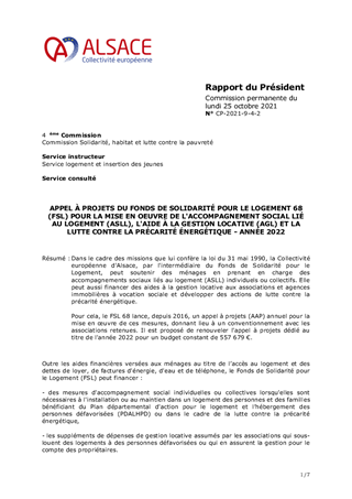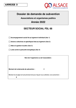APPEL À PROJETS DU FONDS DE SOLIDARITÉ POUR LE LOGEMENT 68 (FSL) POUR LA MISE EN OEUVRE DE L'ACCOMPAGNEMENT SOCIAL LIÉ AU LOGEMENT (ASLL), L'AIDE À LA GESTION LOCATIVE (AGL) ET LA LUTTE CONTRE LA PRÉCARITÉ ÉNERGÉTIQUE - ANNÉE 2022