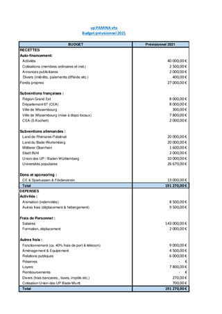 Le présent rapport propose d’attribuer une subvention de fonctionnement d’un montant de 6 000 € à l’Université Populaire PAMINA vhs au titre de l’année 2021. Cette structure associative reconnue d’utilité publique se présente comme un acteur majeur du Nord du Bas-Rhin en termes d’organisation d’activités transfrontalières et constitue un lieu de rencontre de la société civile franco-allemande.