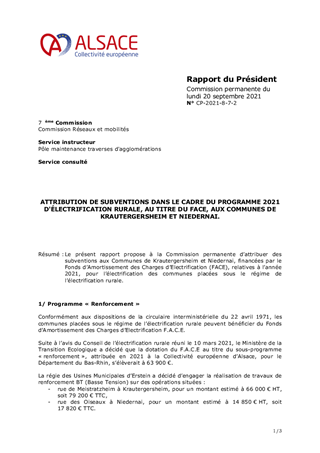 Le présent rapport propose à la Commission permanente d’attribuer des subventions aux Communes de Krautergersheim et Niedernai, financées par le Fonds d’Amortissement des Charges d’Electrification (FACE), relatives à l’année 2021, pour l’électrification des communes placées sous le régime de l’électrification rurale.