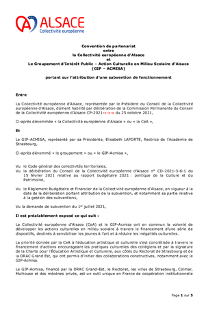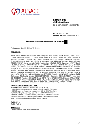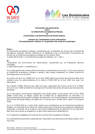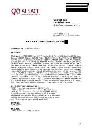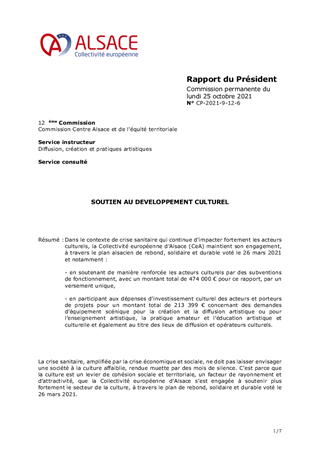 Dans le contexte de crise sanitaire qui continue d’impacter fortement les acteurs culturels, la Collectivité européenne d’Alsace (CeA) maintient son engagement, à travers le plan alsacien de rebond, solidaire et durable voté le 26 mars 2021 et notamment : - en soutenant de manière renforcée les acteurs culturels par des subventions de fonctionnement, avec un montant total de 474 000 € pour ce rapport, par un versement unique, - en participant aux dépenses d’investissement culturel des acteurs et porteurs de projets pour un montant total de 213 399 € concernant des demandes d’équipement scénique pour la création et la diffusion artistique ou pour l’enseignement artistique, la pratique amateur et l’éducation artistique et culturelle et également au titre des lieux de diffusion et opérateurs culturels.