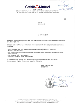 Il vous est proposé d’accorder la garantie départementale à hauteur de 100 % à l’EHPAD Dr PIERRE GILET à DANNEMARIE pour un emprunt d’un montant de 350 000 € souscrit auprès du Crédit Mutuel pour le refinancement de deux prêts contractés pour la restructuration de l’EHPAD.