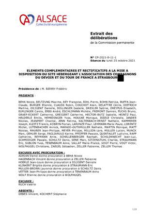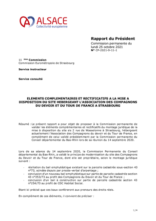 Le présent rapport a pour objet de proposer à la Commission permanente de valider les éléments complémentaires et rectificatifs du montage juridique de la mise à disposition du site sis 2 rue de Wasselonne à Strasbourg, hébergeant actuellement l’Association des Compagnons du devoir et du Tour de France, en complément de celui validé précédemment par la Commission permanente du Conseil départemental du Bas-Rhin lors de sa réunion du 14 septembre 2020.