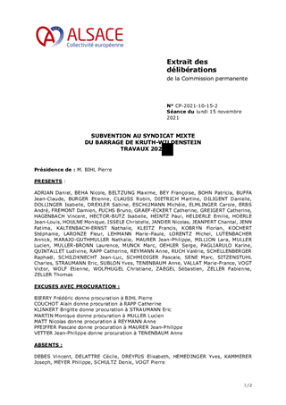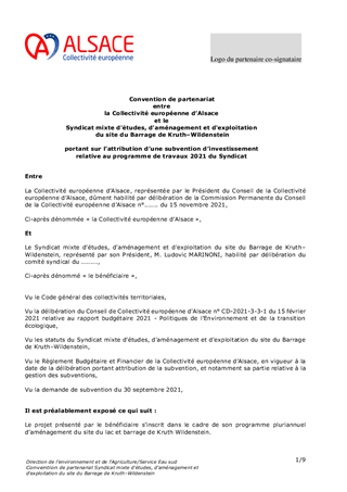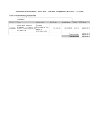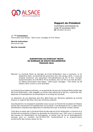 Le Syndicat Mixte du Barrage de Kruth-Wildenstein nous a transmis, le 21 septembre 2021, sa demande de subvention pour les travaux 2021. Il vous est proposé d’octroyer une subvention d’investissement de 90 % d’un montant subventionnable de 135 945 € HT au Syndicat, soit 122 351 € au titre de 2021. La 15ème Commission Sud Alsace - Saint-Louis -Sundgau - Thur-Doller du 28 octobre 2021 a émis un avis favorable.