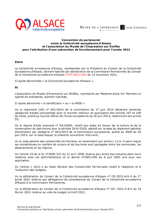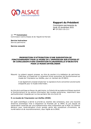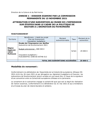 Le présent rapport propose, au titre du soutien à la médiation du patrimoine, d’attribuer et d’autoriser le versement d’une subvention de fonctionnement au musée de l’impression sur étoffes, pour un montant de 25 000 €. Il est également proposé d’autoriser la signature d’une convention pluriannuelle d’objectifs pour le musée Unterlinden.