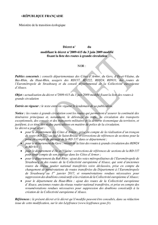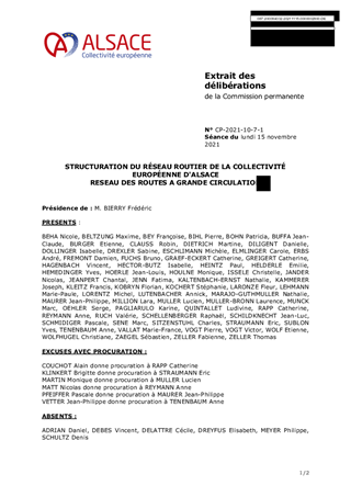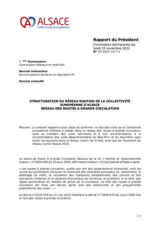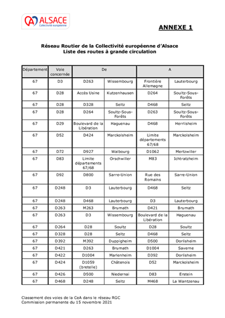 Le présent rapport a pour objet de confirmer la liste des voies de la Collectivité européenne d’Alsace à classer dans le réseau des routes à grande circulation, suite au transfert des voies nationales et à leur renumérotation, à la renumérotation des voies départementales du Bas-Rhin et du Haut-Rhin pour éviter les doublons dans le réseau routier de la CeA, ainsi que de l’évolution du réseau routier depuis 2010.