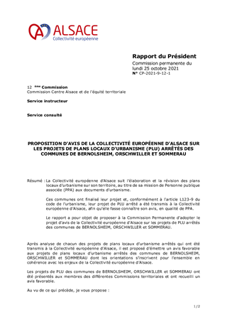 La Collectivité européenne d’Alsace suit l’élaboration et la révision des plans locaux d’urbanisme sur son territoire, au titre de sa mission de Personne publique associée (PPA) aux documents d’urbanisme. Ces communes ont finalisé leur projet et, conformément à l'article L123-9 du code de l’urbanisme, leur projet de PLU arrêté a été transmis à la Collectivité européenne d’Alsace, afin qu’elle fasse connaître son avis, en qualité de PPA. Le rapport a pour objet de proposer à la Commission Permanente d’adopter le projet d’avis de la Collectivité européenne d’Alsace sur les projets de PLU arrêtés des communes de BERNOLSHEIM, ORSCHWILLER et SOMMERAU.