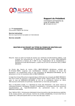 Dans le cadre du Fonds de soutien aux initiatives transfrontalières (FSIT), il est proposé de subventionner le Cercle des Sports et Loisirs NEUF-BRISACH Athlétisme à hauteur de 3 000 € pour l’organisation de la manifestation « Nordique et Cross des Remparts », ayant lieu le 13 et 14 novembre 2021, à NEUF BRISACH.