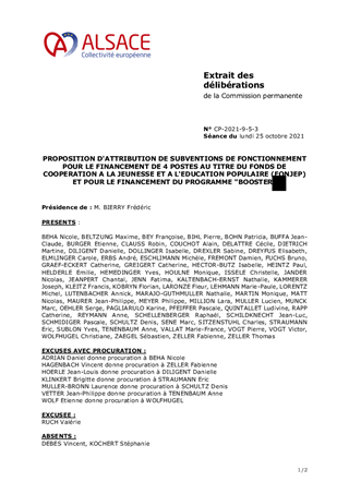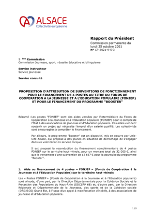 Les postes "FONJEP" sont des aides versées par l’intermédiaire du Fonds de Coopération à la Jeunesse et à l'Education populaire (FONJEP) pour le compte de l’État à des associations de jeunesse et d’éducation populaire. Ces aides viennent soutenir un projet qui nécessite l’emploi d’un salarié qualifié. Les collectivités sont encouragées à compléter le financement. Par ailleurs, le programme "Booster" est un dispositif, mis en oeuvre par Unis-Cité Alsace, qui propose à des jeunes en situation de décrochage de s'engager dans un volontariat en service civique. Il est proposé la reconduction du financement complémentaire de 4 postes FONJEP sur le territoire haut-rhinois, pour un montant total de 32 000 €, ainsi que le versement d'une subvention de 12 667 € pour la poursuite du programme "Booster".