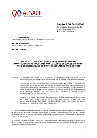 La politique éducative de la Collectivité européenne d’Alsace joue un rôle fondamental de socialisation et d'ouverture sur le monde des jeunes alsaciens. Elle finance le fonctionnement des collèges publics et privés et attribue des subventions pour les voyages et sorties scolaires organisés par les collèges et écoles publics et privés, selon des modalités de participation à ce jour différentes entre le Bas-Rhin et le Haut-Rhin. Celles-ci se poursuivront jusqu’à l’élaboration d’une nouvelle politique de participation aux voyages et sorties scolaires attendue pour le 1er janvier 2023. Ce rapport propose l’attribution de subventions de fonctionnement d’un montant de 21 448 € dans le cadre de sorties scolaires avec nuitées du Haut-Rhin pour les années scolaires 2020/2021 et 2021/2022. Elles concernent 11 écoles publiques, et 1 collège privé, soit 596 élèves.