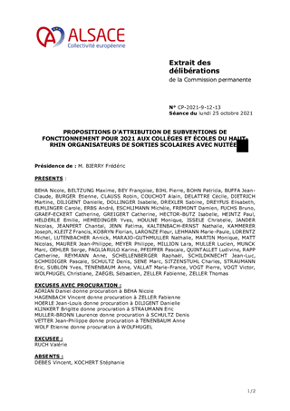 PROPOSITIONS D'ATTRIBUTION DE SUBVENTIONS DE FONCTIONNEMENT POUR 2021 AUX COLLÈGES ET ÉCOLES DU HAUT-RHIN ORGANISATEURS DE SORTIES SCOLAIRES AVEC NUITÉES