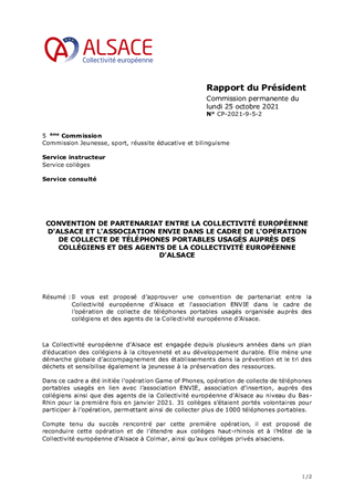 Il vous est proposé d’approuver une convention de partenariat entre la Collectivité européenne d’Alsace et l'association ENVIE dans le cadre de l’opération de collecte de téléphones portables usagés organisée auprès des collégiens et des agents de la Collectivité européenne d’Alsace.