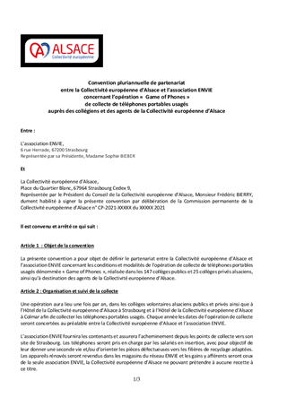 CONVENTION DE PARTENARIAT ENTRE LA COLLECTIVITÉ EUROPÉENNE D'ALSACE ET L'ASSOCIATION ENVIE DANS LE CADRE DE L'OPÉRATION DE COLLECTE DE TÉLÉPHONES PORTABLES USAGÉS AUPRÈS DES COLLÉGIENS ET DES AGENTS DE LA COLLECTIVITÉ EUROPÉENNE D'ALSACE