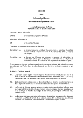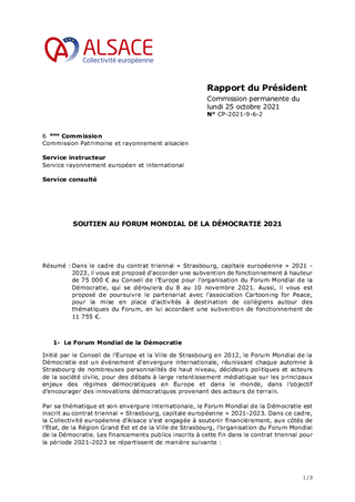 Dans le cadre du contrat triennal « Strasbourg, capitale européenne » 2021 - 2023, il vous est proposé d’accorder une subvention de fonctionnement à hauteur de 75 000 € au Conseil de l’Europe pour l’organisation du Forum Mondial de la Démocratie, qui se déroulera du 8 au 10 novembre 2021. Aussi, il vous est proposé de poursuivre le partenariat avec l’association Cartooning for Peace, pour la mise en place d’activités à destination de collégiens autour des thématiques du Forum, en lui accordant une subvention de fonctionnement de 11 755 €.