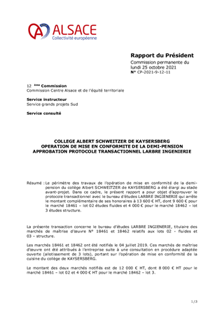 Le périmètre des travaux de l’opération de mise en conformité de la demi-pension du collège Albert SCHWEITZER de KAYSERSBERG a été élargi au stade avant-projet. Dans ce cadre, le présent rapport a pour objet d’approuver le protocole transactionnel avec le bureau d’études LARBRE INGIENERIE qui arrête le montant complémentaire de ses honoraires à 13 600 € HT, dont 9 600 € pour le marché 18461 – lot 02 études fluides et 4 000 € pour le marché 18462 – lot 3 études structure.