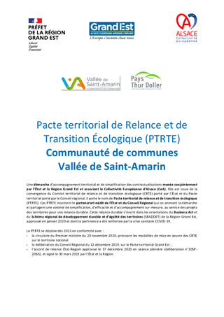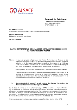 Il vous est proposé d’approuver les Pactes Territoriaux de Relance et de Transition Ecologique (PTRTE) de la Communauté de Communes de la Vallée de la Doller et du Soultzbach, de la Communauté de Communes de la Vallée de Saint-Amarin et de la Communauté de Communes Thann-Cernay dont les projets sont joints en annexe et d’en autoriser la signature par le Président. Ces projets ont recueilli l’avis favorable de la Commission territoriale Sud Alsace. Il est proposé de valoriser dans le document les engagements pris au titre de la Politique de Développement Territorial du Haut-Rhin. Les futurs projets feront l'objet d'une analyse à l'aune des nouvelles modalités de contractualisation de la Collectivité européenne d'Alsace avec les territoires.
