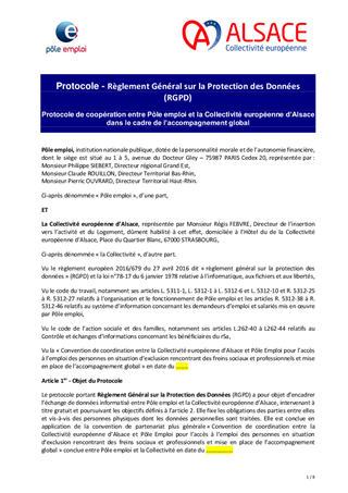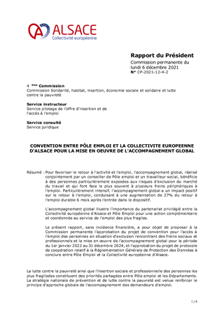 Pour favoriser le retour à l'activité et l'emploi, l'accompagnement global, réalisé conjointement par un conseiller de Pôle emploi et un travailleur social, bénéficie à des personnes particulièrement exposées aux risques d’exclusion du marché du travail et qui font face le plus souvent à plusieurs freins périphériques à l’emploi. Particulièrement intensif, l’accompagnement global a un impact positif sur le retour à l’emploi, conduisant à une augmentation de 27% du retour à l’emploi durable 6 mois après l’entrée dans le dispositif. L'accompagnement global illustre l'importance du partenariat privilégié entre la Collectivité européenne d'Alsace et Pôle Emploi pour une action complémentaire et coordonnée au service de l'emploi des plus fragiles. Le présent rapport, sans incidence financière, a pour objet de proposer à la Commission permanente l’approbation du projet de convention pour l'accès à l'emploi des personnes en situation d'exclusion rencontrant des freins sociaux et professionnels et la mise en œuvre de l’accompagnement global pour la période du 1er janvier 2022 au 31 décembre 2024, et l'approbation du projet de protocole de coopération relatif à la Réglementation Générale de Protection des Données à conclure entre Pôle Emploi et la Collectivité européenne d’Alsace.