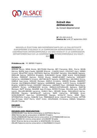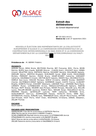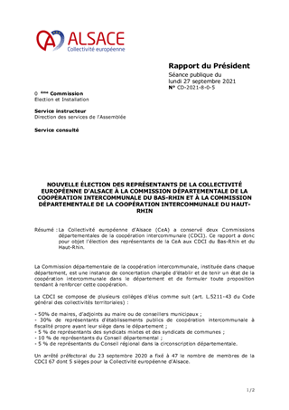 La Collectivité européenne d’Alsace (CeA) a conservé deux Commissions départementales de la coopération intercommunale (CDCI). Ce rapport a donc pour objet l'élection des représentants de la CeA aux CDCI du Bas-Rhin et du Haut-Rhin.