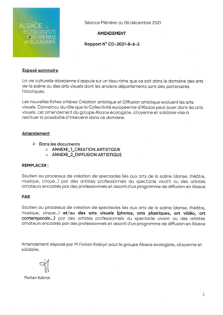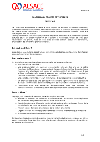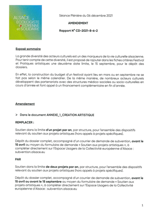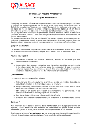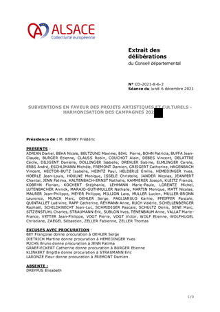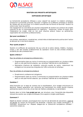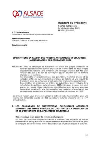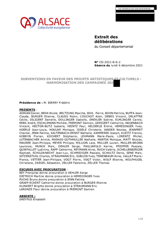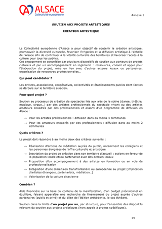 En 2021, la campagne de subvention en faveur des projets artistiques et culturels est restée basée sur des dispositifs en vigueur dans les deux anciens départements alsaciens ; elle a mobilisé une enveloppe totale de 836 460 € qui intégrait 111 000 € du plan de rebond pour pouvoir soutenir tous les dossiers éligibles sur le territoire. Ces dispositifs se caractérisent par des périmètres, modalités d’accès et de validation différents qui alimentent un manque de lisibilité et une iniquité de traitement entre les porteurs de projet, selon leur implantation géographique. Sans modifier en profondeur les critères de subvention, ce qui relèvera de la refondation des politiques culturelles pour 2023, mais pour préparer celle-ci et écarter les risques liés au maintien de procédés divergents sur deux exercices budgétaires consécutifs, une harmonisation des modalités d’organisation des campagnes de subventions artistiques et culturelles est proposée en 2022.