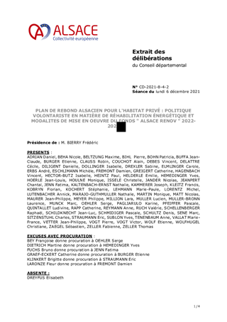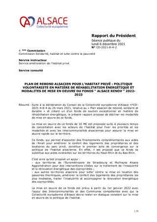 PLAN DE REBOND ALSACIEN POUR L'HABITAT PRIVÉ : POLITIQUE VOLONTARISTE EN MATIÈRE DE RÉHABILITATION ÉNERGÉTIQUE ET MODALITES DE MISE EN OEUVRE DU FONDS " ALSACE RENOV " 2022-2023