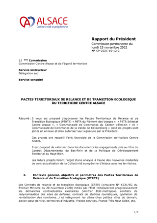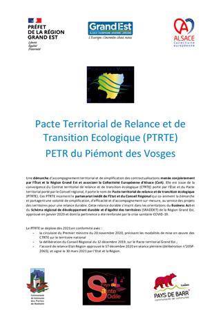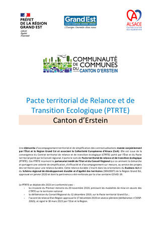 Il vous est proposé d’approuver les Pactes Territoriaux de Relance et de Transition Ecologique (PTRTE) « PETR du Piémont des Vosges », « PETR Sélestat Centre Alsace », « Communauté de Communes du Canton d’Erstein » et « Communauté de Communes de la Vallée de Kaysersberg » dont les projets sont joints en annexe et d’en autoriser leur signature par le Président. Ces projets ont recueilli l’avis favorable de la Commission territoriale Centre Alsace. Il est proposé de valoriser dans les documents les engagements pris au titre du Contrat Départemental du Bas-Rhin et de la Politique de Développement Territorial du Haut-Rhin. Les futurs projets feront l'objet d'une analyse à l'aune des nouvelles modalités de contractualisation de la Collectivité européenne d'Alsace avec les territoires.