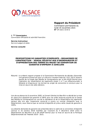 Le présent rapport propose à la Commission Permanente de décider d’accorder une garantie d’emprunt pour un prêt d’un montant total de 1 611 192 € souscrit auprès de la Caisse des Dépôts et Consignations par la SA d’HLM Domial pour l’opération de réhabilitation de logements situés 1 à 7 rue d’Ebersmunster à Sélestat et d’approuver les termes du projet de convention à conclure pour la mise en œuvre de cette décision.