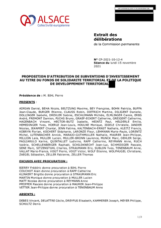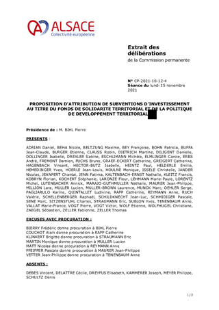 Le présent rapport a pour objet de proposer à la Commission permanente d'approuver l'attribution de subventions d'investissement au titre du Fonds de Solidarité Territoriale (FST), pour un montant total de 1 546 431 € ainsi que l'attribution de deux subventions d'investissement au titre de la Politique de Développement Territoriale 68 pour un montant total de 180 000 €.