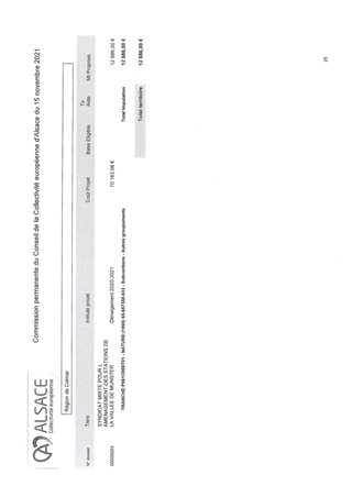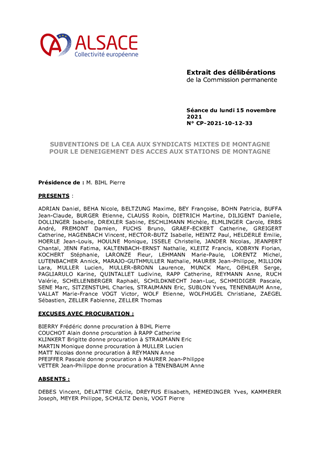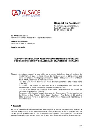 Le présent rapport a pour objet de proposer d’attribuer des subventions de fonctionnement aux syndicats mixtes de montagne pour le déneigement des accès aux sites de montagne pour la saison 2020 - 2021 pour un montant total de 30 740 €, réparti de la manière suivante : - 13 150 € en faveur du Syndicat Mixte d’Aménagement du site du Lac Blanc (SMALB) ; - 12 686 € en faveur du Syndicat Mixte d’aménagement des stations de montagne de la Vallée de Munster/Hautes Vosges (SMVM) ; - 4 904 € en faveur du Syndicat Mixte pour l’aménagement du Massif du Markstein Grand Ballon (SMMGB) Ce rapport a fait l'objet d'un avis favorable des Commissions Territoriales Région de Colmar et Sud Alsace - Saint-Louis -Sundgau - Thur-Doller du 28 octobre 2021, ainsi que l'avis de la Commission Thématique Réseaux et mobilités du 5 novembre 2021.
