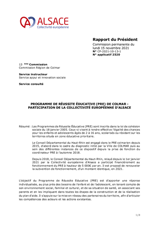 Les Programmes de Réussite Éducative (PRE) sont inscrits dans la loi de cohésion sociale du 18 janvier 2005. Ceux-ci visent à rendre effective l’égalité des chances pour les enfants et adolescents âgés de 2 à 16 ans, scolarisés ou résidant sur les territoires situés en zone éducative prioritaire. Le Conseil Départemental du Haut-Rhin est engagé dans le PRE colmarien depuis 2015, d'abord dans le cadre du diagnostic initié par la Ville de COLMAR puis au sein des différentes instances de ce dispositif depuis la prise de fonction du coordinateur PRE à l'automne 2018. Depuis 2018, le Conseil Départemental du Haut-Rhin, relayé depuis le 1er janvier 2021 par la Collectivité européenne d’Alsace a participé financièrement au fonctionnement du PRE à hauteur de 5 000€ par an. Il est proposé de renouveler la subvention de fonctionnement, d’un montant identique, en 2021.