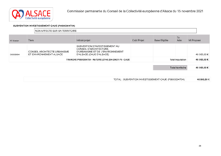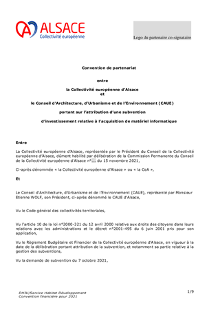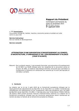 Par le présent rapport, il est proposé d’accorder une subvention d’investissement de 46 000 € au CAUE d’Alsace selon les modalités de la convention jointe en annexe. En effet, le matériel informatique doit être renouvelé pour permettre la configuration à distance et le télétravail aux salariés qui ne sont pas équipés en ordinateur portable.