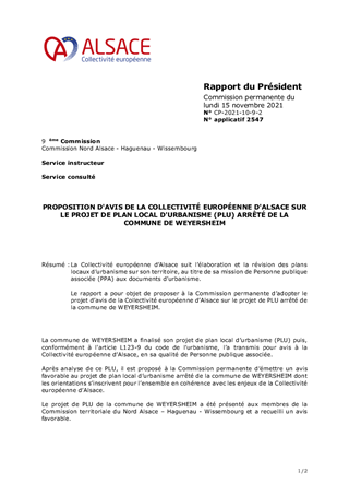La Collectivité européenne d’Alsace suit l’élaboration et la révision des plans locaux d’urbanisme sur son territoire, au titre de sa mission de Personne publique associée (PPA) aux documents d’urbanisme. Le rapport a pour objet de proposer à la Commission permanente d’adopter le projet d’avis de la Collectivité européenne d’Alsace sur le projet de PLU arrêté de la commune de WEYERSHEIM.