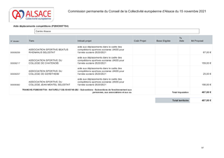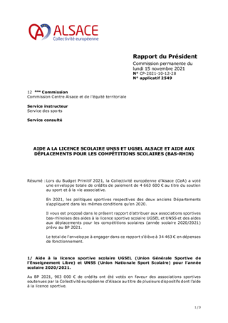 Lors du Budget Primitif 2021, la Collectivité européenne d’Alsace (CeA) a voté une enveloppe totale de crédits de paiement de 4 663 600 € au titre du soutien au sport et à la vie associative. En 2021, les politiques sportives respectives des deux anciens Départements s'appliquent dans les mêmes conditions qu’en 2020. Il vous est proposé dans le présent rapport d'attribuer aux associations sportives bas-rhinoises des aides à la licence sportive scolaire UGSEL et UNSS et des aides aux déplacements pour les compétitions scolaires (année scolaire 2020/2021) prévu au BP 2021. Le total de l'enveloppe à engager dans ce rapport s'élève à 34 463 € en dépenses de fonctionnement.