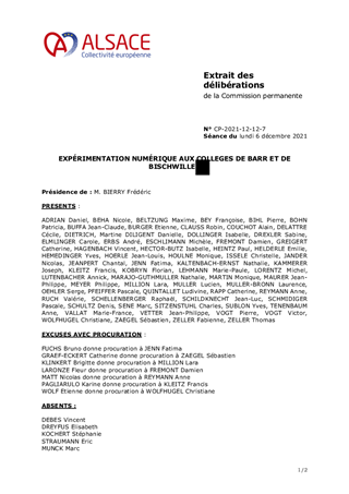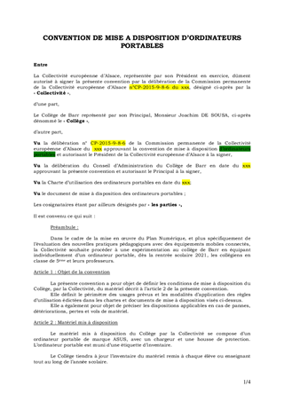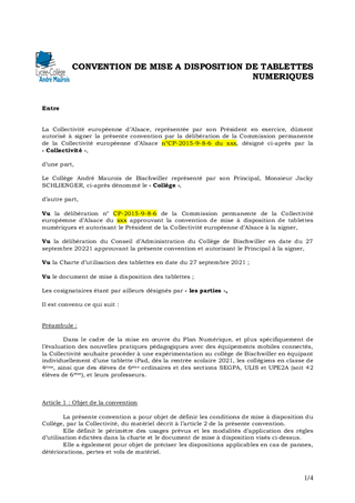 Les collèges de Barr et André Maurois de Bischwiller ont souhaité expérimenter auprès de leurs collégiens l’attribution d’un poste informatique individuel (tablette ou PC portable) pour un usage numérique en classe et à domicile. La CeA apporte son soutien à ces projets en assurant le financement des postes informatiques, le déploiement d'une infrastructure réseau informatique adaptée, l’augmentation du débit internet et la maintenance des postes. Le présent rapport a pour objet de vous faire approuver la convention de partenariat à conclure entre le collège concerné et la Collectivité européenne d'Alsace.