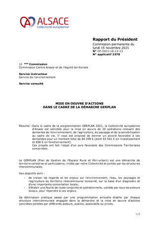 Dans le cadre de la programmation GERPLAN 2021, la Collectivité européenne d’Alsace est sollicitée pour la mise en œuvre de 20 opérations relevant des domaines de l’environnement, de l’agriculture, du paysage et de la sensibilisation au cadre de vie. Il vous est proposé de donner un accord favorable à ces demandes pour un montant total de 64 399 € (dont 63 561 € en investissement et 838 € en fonctionnement). Ces projets ont fait l’objet d’un avis favorable des Commissions Territoriales concernées.
