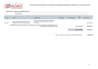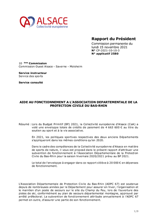 Lors du Budget Primitif (BP) 2021, la Collectivité européenne d’Alsace (CeA) a voté une enveloppe totale de crédits de paiement de 4 663 600 € au titre du soutien au sport et à la vie associative. En 2021, les politiques sportives respectives des deux anciens Départements s’appliqueront dans les mêmes conditions qu’en 2020. Dans le cadre des compétences de la Collectivité européenne d'Alsace en matière de sports de nature, il vous est proposé dans le présent rapport d'attribuer une subvention de fonctionnement à l'Association Départementale de la Protection Civile du Bas-Rhin pour la saison hivernale 2020/2021 prévu au BP 2021. Le total de l'enveloppe à engager dans ce rapport s'élève à 20 000 € en dépenses de fonctionnement.