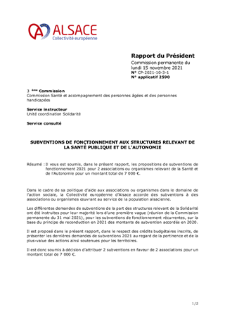 Il vous est soumis, dans le présent rapport, les propositions de subventions de fonctionnement 2021 pour 2 associations ou organismes relevant de la Santé et de l’Autonomie pour un montant total de 7 000 €.