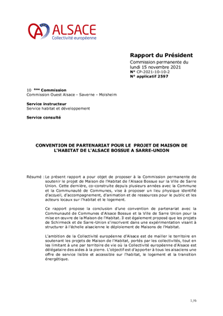 Le présent rapport a pour objet de proposer à la Commission permanente de soutenir le projet de Maison de l’Habitat de l'Alsace Bossue sur la Ville de Sarre Union. Cette dernière, co-construite depuis plusieurs années avec la Commune et la Communauté de Communes, vise à proposer un lieu physique identifié d’accueil, d’accompagnement, d’animation et de ressources pour le public et les acteurs locaux sur l'habitat et le logement. Ce rapport propose la conclusion d'une convention de partenariat avec la Communauté de Communes d'Alsace Bossue et la Ville de Sarre Union pour la mise en œuvre de la Maison de l'Habitat. Il est également proposé que les projets de Schirmeck et de Sarre-Union s'inscrivent dans une expérimentation visant à structurer à l’échelle alsacienne le déploiement de Maisons de l’Habitat. L’ambition de la Collectivité européenne d’Alsace est de mailler le territoire en soutenant les projets de Maison de l'Habitat, portés par les collectivités, tout en les limitant à une par territoire de vie où la Collectivité européenne d'Alsace est délégataire des aides à la pierre. L’objectif est d’apporter à tous les alsaciens une offre de service lisible et accessible sur l’habitat, le logement et la transition énergétique.