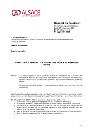 Le présent rapport a pour objet de décider de l’adhésion de la Collectivité européenne d’Alsace à l’Association des Maires Ville & Banlieue de France qui fédère un réseau d’élus autour des questions de développement des quartiers fragiles. En tant que membre associé, cette adhésion ne génère pas de coût pour la collectivité.