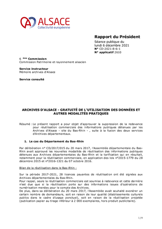 Le présent rapport a pour objet d’approuver la suppression de la redevance pour réutilisation commerciale des informations publiques détenues par les Archives d’Alsace - site du Bas-Rhin - , suite à la fusion des deux services d’Archives départementaux.