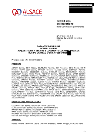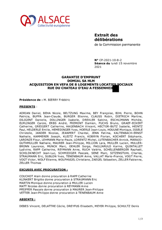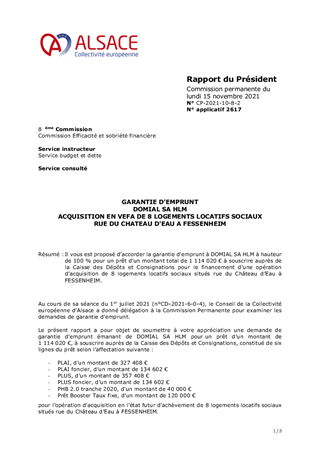 Il vous est proposé d’accorder la garantie d'emprunt à DOMIAL SA HLM à hauteur de 100 % pour un prêt d’un montant total de 1 114 020 € à souscrire auprès de la Caisse des Dépôts et Consignations pour le financement d'une opération d’acquisition de 8 logements locatifs sociaux situés rue du Château d’Eau à FESSENHEIM.