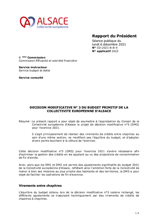 Le présent rapport a pour objet de soumettre à l’approbation du Conseil de la Collectivité européenne d’Alsace le projet de décision modificative n°3 (DM3) pour l’exercice 2021. Il s'agit principalement de réaliser des virements de crédits entre chapitres au sein d'une même section, ne modifiant pas l’équilibre du budget, et d'adopter divers points touchant à la clôture de l’exercice.