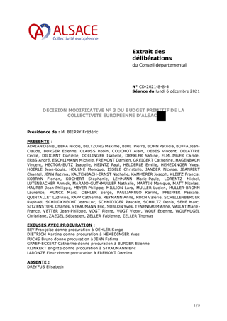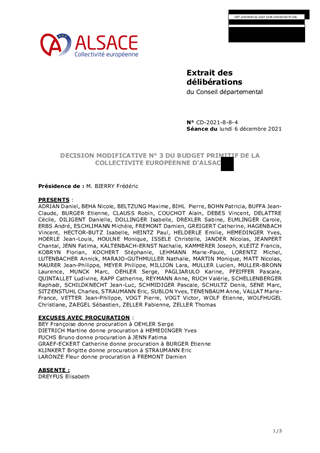 DECISION MODIFICATIVE N° 3 DU BUDGET PRIMITIF DE LA COLLECTIVITE EUROPEENNE D'ALSACE