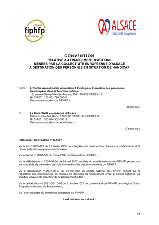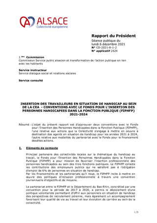 L'objet du présent rapport est d'approuver deux conventions avec le Fonds pour l'Insertion des Personnes Handicapées dans la Fonction Publique (FIPHFP), l'une relative aux actions que la Collectivité s'engage à mettre en oeuvre à destination des agents en situation de handicap pour les années 2021 à 2024, l'autre relative aux modalités du partenariat avec le Fonds pour le financement desdites actions.