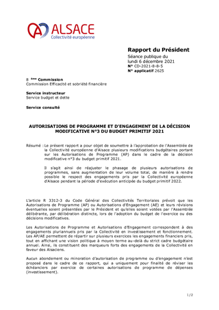 Le présent rapport a pour objet de soumettre à l’approbation de l’Assemblée de la Collectivité européenne d’Alsace plusieurs modifications budgétaires portant sur les Autorisations de Programme (AP) dans le cadre de la décision modificative n°3 du budget primitif 2021. Il s’agit ainsi de réajuster le phasage de plusieurs autorisations de programmes, sans augmentation de leur volume total, de manière à rendre possible le respect des engagements pris par la Collectivité européenne d'Alsace pendant la période d’exécution anticipée du budget primitif 2022.