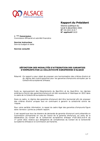 Ce rapport a pour objet de proposer une harmonisation des critères d'octroi et du régime des contre-garanties pour les garanties d'emprunts octroyées par la Collectivité européenne d’Alsace.