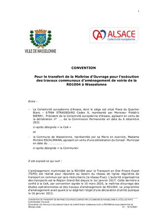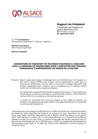 Dans le cadre des travaux d'aménagement de la RD1004 pour le Transport en Site Propre Ouest (TSPO), des travaux sont programmés en 2022 dans la traverse de Wasselonne. De son côté, la commune envisage également des travaux d'éclairage public relevant de sa compétence sur le domaine public routier de la Collectivité européenne d'Alsace. Afin de garantir une bonne coordination et qualité des travaux, il est proposé que la CeA assure la maîtrise d'ouvrage de l'ensemble des travaux, conformément à l'article L2422-12 du Code de la commande publique. Le projet de convention qui vous est proposé a pour objet de préciser les conditions d'organisation de cette maîtrise d'ouvrage exercée pour le compte de la commune de Wasselonne.
